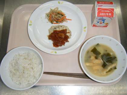 今日の給食は、麦ごはん、牛乳、豆腐入りハンバーグ、こんにゃくサラダ、みそ汁です。