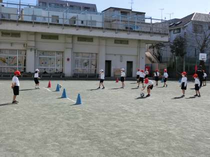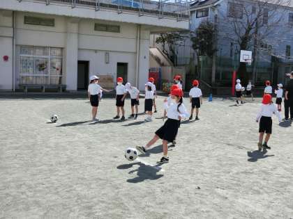 体育「ボーけりゲーム」の学習です。的当てゲームの前段階、ボール操作に慣れ、ボールけりを楽しんでいます。