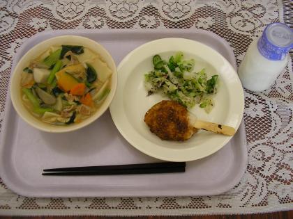 今日のメニューは、ほうとう、牛乳、五平もち、野菜のゆかりかけです。