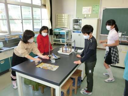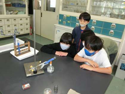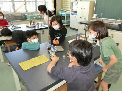 1組理科「ものの温まり方」の学習です。試験管の水を熱する実験を通して、水の温まり方の特徴を調べました。最初は、試験管の中ほどを熱すると、示温インクはどのように色が変わるか調べました。