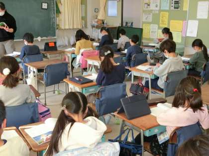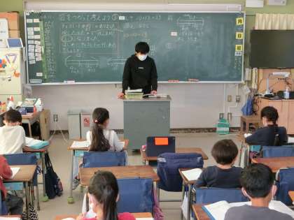 2組算数「図をつかって考えよう」の学習です。どんな式で考えればよいか、テープ図を使って教え合いました。