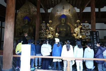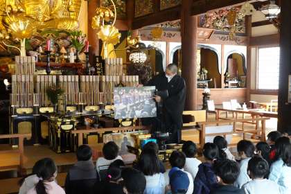 社会と総合的な学習の時間の一環で、浄真寺の見学に行ってきました。浄真寺の方のお話を聞きながら境内や堂内を見学しました。九品仏の名前の由来や歴史、行事など、興味深く聞いていました。静かに見学し、建物に入る時におじぎをしたり、靴をそろえたりする姿から、地域にあるものを大事にしようとする思いを感じました。