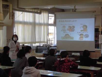 学校薬剤師さんをゲストティーチャーにお迎えして、「薬物乱用防止教室」を行いました。1度でも薬物を体内に取り入れてしまうと、全身に影響があることを学びました。誘われても、はっきりと断る勇気の大切さも知りました。