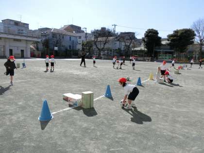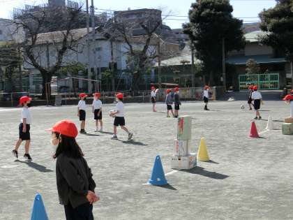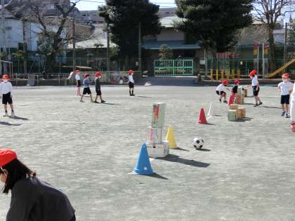 体育「ボールけりゲーム」の学習です。簡単なルールを守って、的当てゲームを楽しみながら行いました。