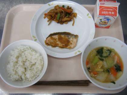今日の給食は、麦ごはん、牛乳、魚のバーベキューソース、きんぴら煮、みそ汁です。