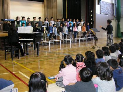 鍵盤ハーモニカ合奏「かえるの合唱」です。ピアノ演奏は、専科の先生で、