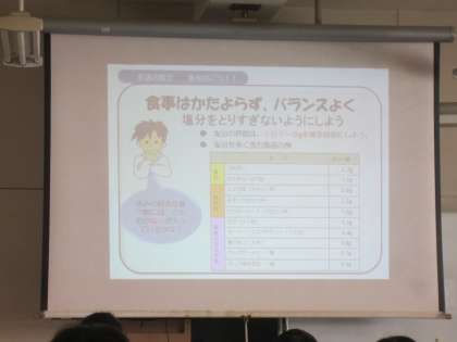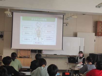 日本人の国民病とも言われる「がん」にいて、養護教諭から話を聞き、がんになる原因や影響などについて知りました。規則正しい生活習慣を心がけることや、成人になったら検査を受けることが大切だと学んでいました。