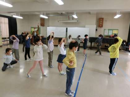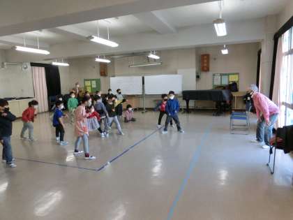 鉛筆や傘などの身近なもの、「歯を磨く」や「アイスを食べる」などの日常の場面を、体を使って表現しました。子どもたちは、手や足の動かし方や表情を工夫して、思い思いの表現をしていました。後半は、友達同士で考えたものを見合う活動もしました。