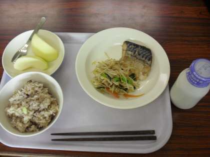 今日の献立は、萩ごはん、牛乳、魚の七味焼き、野菜のおかかかけ、くだものです。