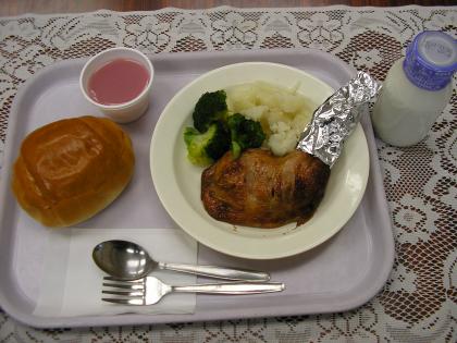 今日のメニューは、バターロールパン、牛乳、ローストチキン、粉ふきいも、