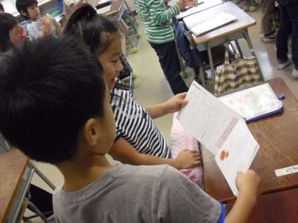 朝、連絡ノートに次の日の予定を書きます。ランドセルから学習用具を机の中に入れてから書きます。早く書くける子が増えています。
