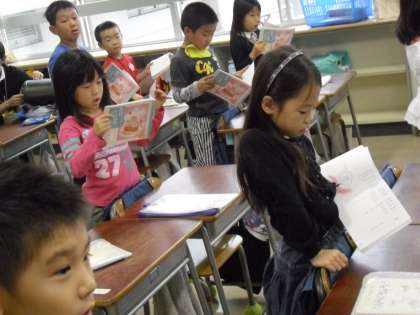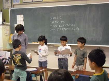 1年生の教室では、・・・朝の会の前に・・・音読リーダー“詩のよってリーダ−がちがいます:全員ができるように配慮しています。”に続いて大きな声で・・・