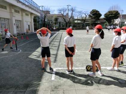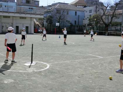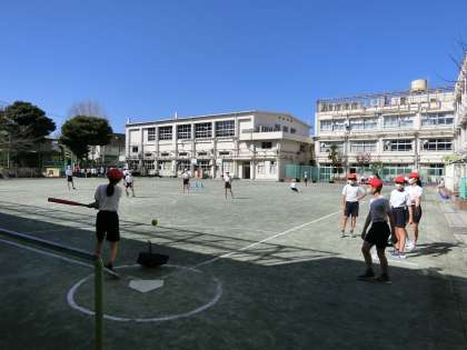 体育「ベースボール型」で、チームごとに作戦を考えて、ティーボールを基にした簡易化されたゲームを行いました。