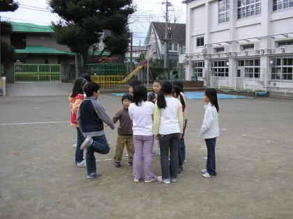 3年生は、「スポーツお楽しみ会」を校庭で行っていました。いろいろなゲームを取り入れて、体を思いきり動かして、楽しんでいました。場面は、子どもたちが相談しているところです。