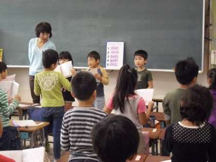 係のリーダーが先生と始めに読み・・・クラスのみんなが続いて読みます。準備するのが速い子が増えています。