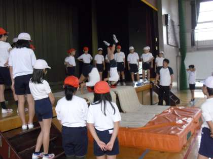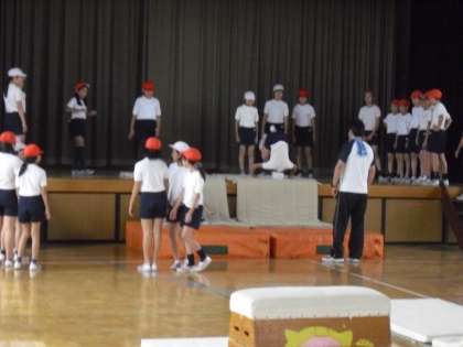 “体育:マット運動”です。先生が技を見せて・・技のポイントを説明していました。こつをつかんだ子もいました。