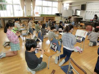 音楽「オーラリー」の曲を、リコーダーで演奏しました。自分の姿をタブレットで録画し、指使いや奏法を振り返りました。