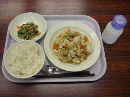 今日の献立は、ご飯、牛乳、豆腐の五目いため、塩ナムルです。