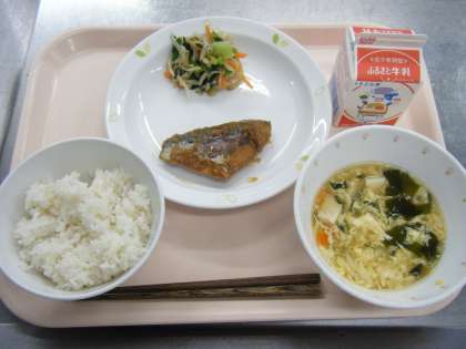 今日の給食は、麦ごはん、牛乳、さばのみそ煮、おひたし、かきたま汁です。