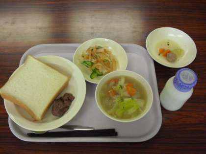 今日の献立は、食パン、牛乳、ココアクリーム、肉団子スープ、大根サラダです。