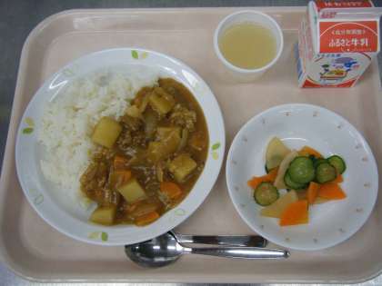 今日の給食は、カレーライス、牛乳、シャキシャキ野菜、りんごゼリーです。