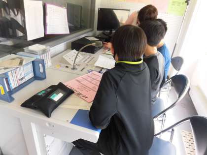 放送委員会担当の先生から丁寧に機械操作の仕方や原稿の読み方の説明を受けています。