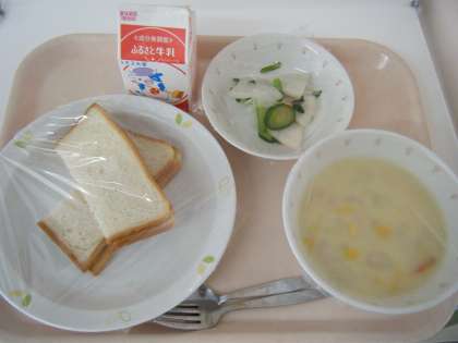 今日の給食は、ジャムサンド(イチゴ)、牛乳、野菜のレモンかけ、コーンシチューです。