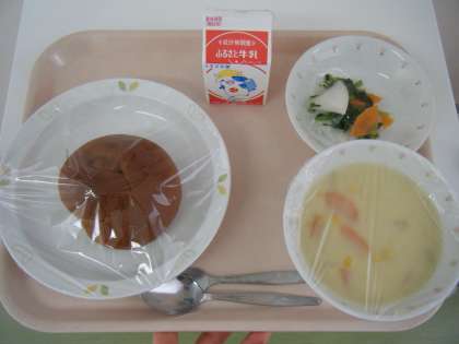 ジャムサンド(イチゴ)は、入荷状況の変更により、4・5・6年生は食パンをココアパンに変更して、ココアパンとイチゴジャムを提供させていただきました。写真左が1・2・3年生の給食、写真右が4・5・6年生の給食です。
