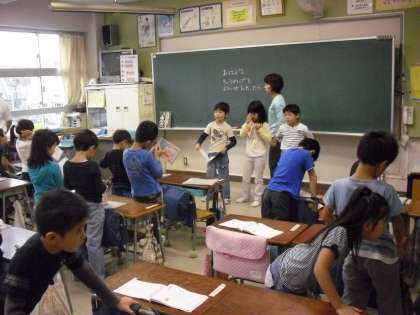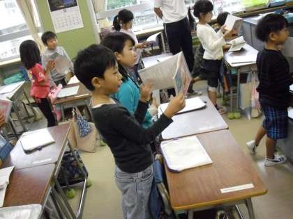 宿題や提出物を所定の場所に出して・・・音読のリーダーが前に立って、音読を始めます。今朝の題材は、“てるてるぼうず”です。リーダーの声が大きかったので・・・気持をこめて読むように・・・工夫するポイントを具体的に話してから、2回目の音読に・・