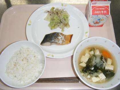 今日の給食は、麦ごはん、牛乳、魚の西京焼き、野菜のゆかりかけ、豆腐汁です。
