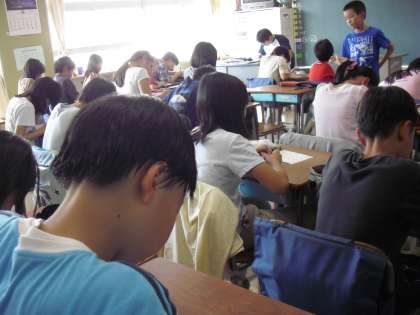 朝の漢字テスト・・・・進度別に挑戦・・・できた子供は、提出して1時間目の学習の準備に・・・・