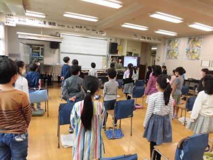 音楽の時間では、まず校歌を大きな声で元気に歌いました。