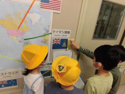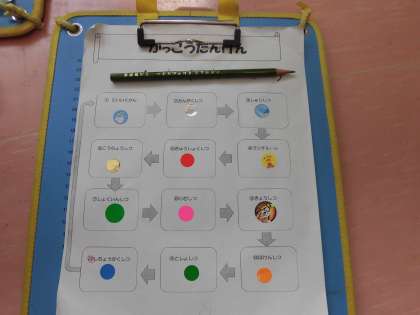 まず、1年生を教室に呼びに行き、12か所の教室を探して、ポスターを1年生と読みます。終わったら台紙にシールを貼ります。シールを全部集めたらランチルームに戻って、1年生とお話をしました。1年生、2年生ともに楽しかった!と笑顔で話していました。