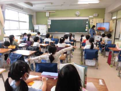 国語の学習では「あさのおひさま」を、海から出てくる朝のおひさまを思い浮かべながら、大きな声で音読しました。