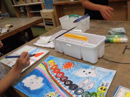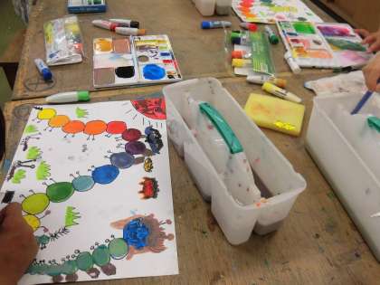 500円玉くらいのまるを13個かき、自分色の「まるむしくん」を描きます。