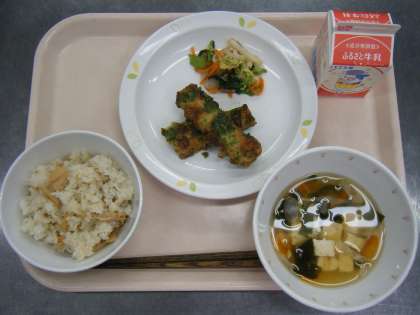 今日の給食は、たけのこごはん、牛乳、ちくわの礒辺あげ、野菜のおかかあえ、すまし汁です。