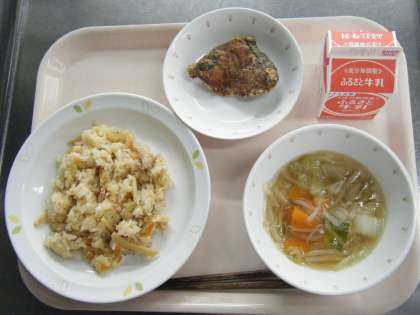 今日の給食は、中華おこわ、牛乳、魚の立田揚げ、中華スープです。