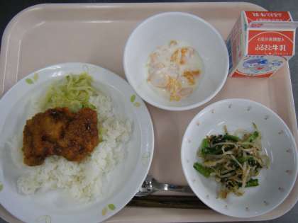 今日の給食は、みそかつ丼、牛乳、こなつなの乾物あえ、みかんヨーグルトです。