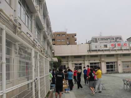 児童が下校した後に、明日の運動会に向けて準備を行っています。