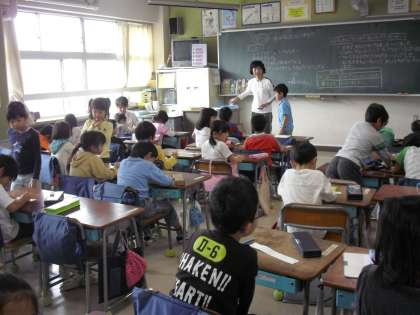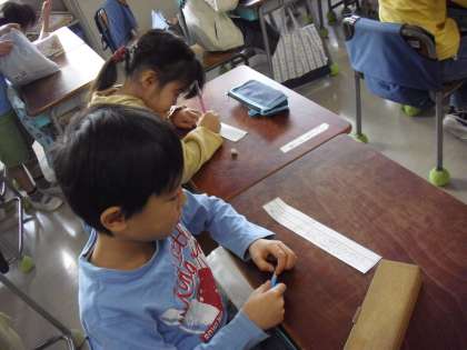 1時間目の終わりに“図工の作品:さなかの絵”の名札を自分の字で描いていました。