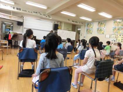 音楽の授業では、ミッキーマウスマーチとメヌエットを聴き、2拍と3拍の違いを感じ取りました。