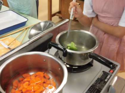 野菜を切り、茹でています。みんなで分担して実習を行っています。