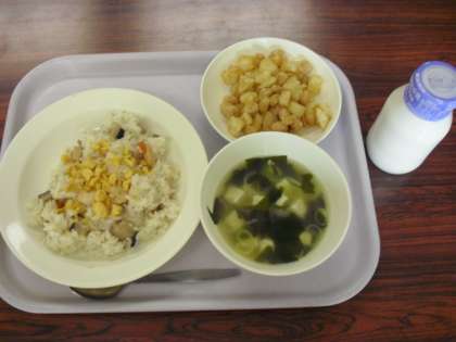 今日の献立は、エビチャーハン、牛乳、わかめスープ、ビーンズポテトです。