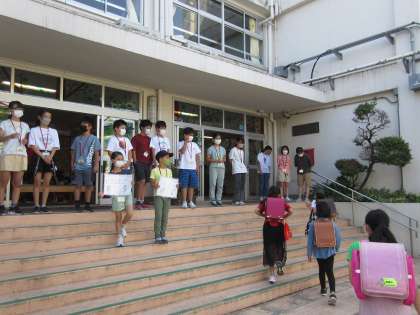 今日も、6年生が校門の前で元気にあいさつをしていました。児童のみなさんも目を見てあいさつしていました。