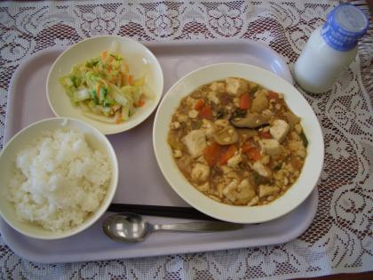 本日の献立は、四川豆腐、辣白菜、ごはん、牛乳です。