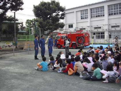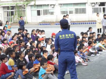 今日は。そのあと、玉川消防署の方々に指導を受けて、初期消火訓練をしました。