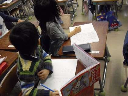 生活科で育てた“アサガオのつる”を使って輪飾りをつくります。その準備をしました。準備ができた子から・・・漢字の練習をノートに書きます。
