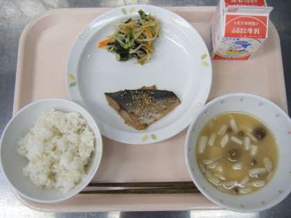 今日の給食は、麦ごはん、牛乳、さばの七味焼き、海藻と野菜の和え物、みそ汁です。
