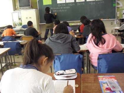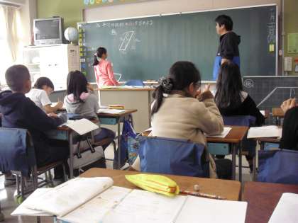 “算数科:少人数指導・平行四辺形の高さを求めよう”・・・黒板の問題をノートに解いて、自分の考えを書いていました。そして、発表へ・・・