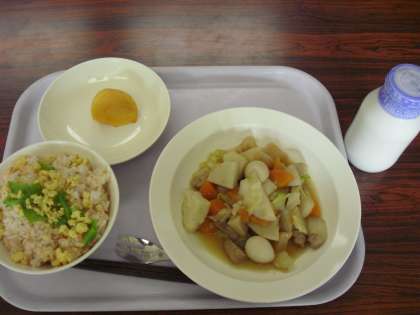 今日の献立は、鮭と卵のまぜごはん、牛乳、大根と豚肉のべっこう煮、くだものです。